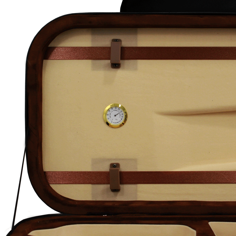 Acabamento interno veludo. Espaço para 2 arcos e Fechadura em metal centralizada com chave. Espaço para espaleira. Fundo extra almofadado para manter o instrumento suspenso. Compartimento interno para acessórios.