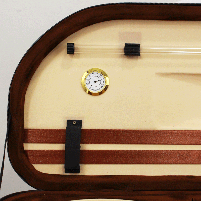 Estojo térmico meia lua para Violino 4/4 Externo confeccionado tecido nylon de alta qualidade. Acabamento interno aveludado. Modelo meia lua. Espaço para 2 arcos. Espaço para espaleira. Possui Higrômetro. Fechadura em metal com chave. Fundo extra almofadado para manter o instrumento suspenso. Compartimento interno para acessórios. Bolso externo para transportar partituras. Alças de…